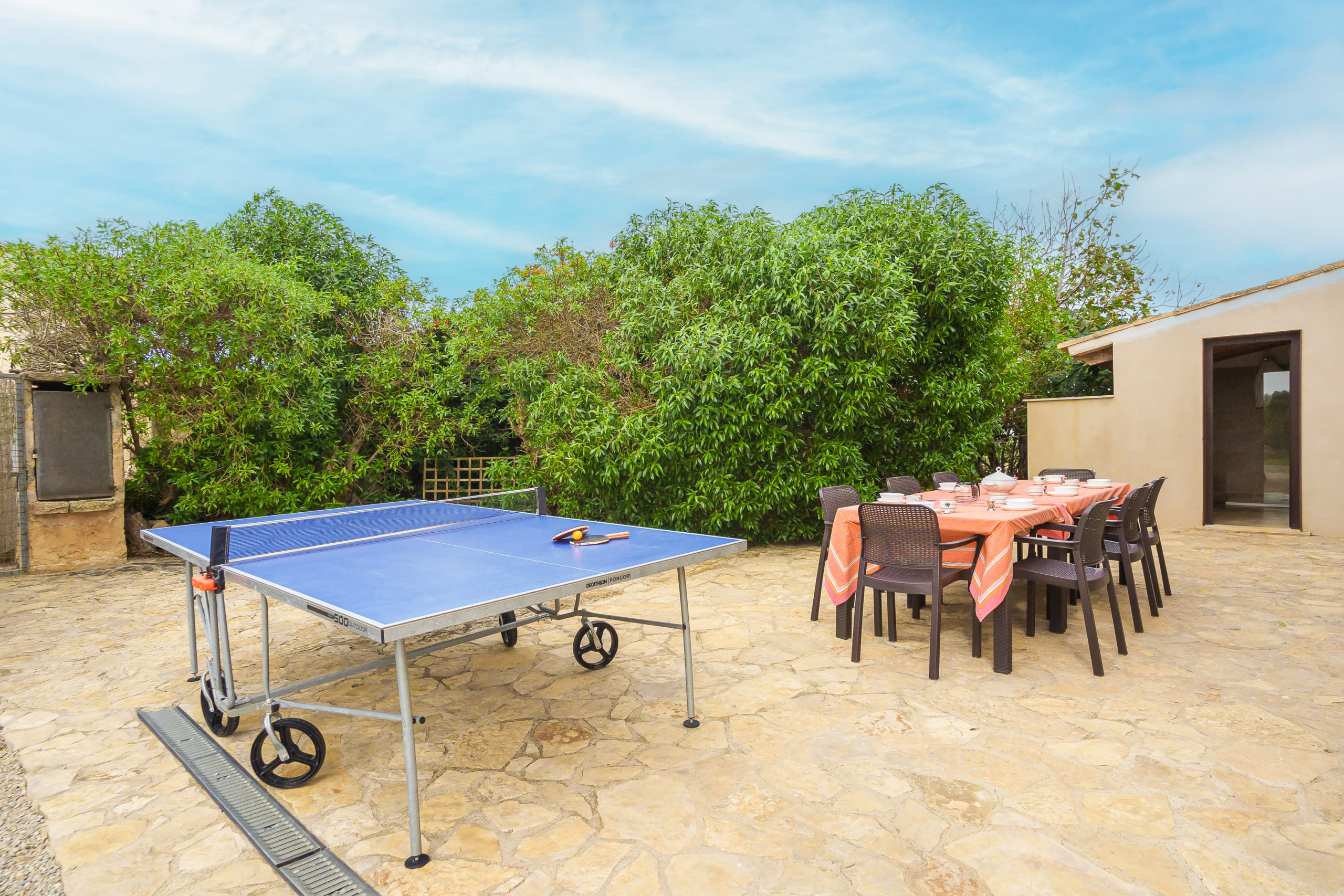 El exterior de Villa Murero está diseñado para disfrutar al máximo del clima mediterráneo. La propiedad cuenta con piscina privada, zona de césped, terraza, hamacas, barbacoa (BBQ) y mesa de ping-pong, ofreciendo múltiples opciones de ocio y relax tanto para adultos como para niños.