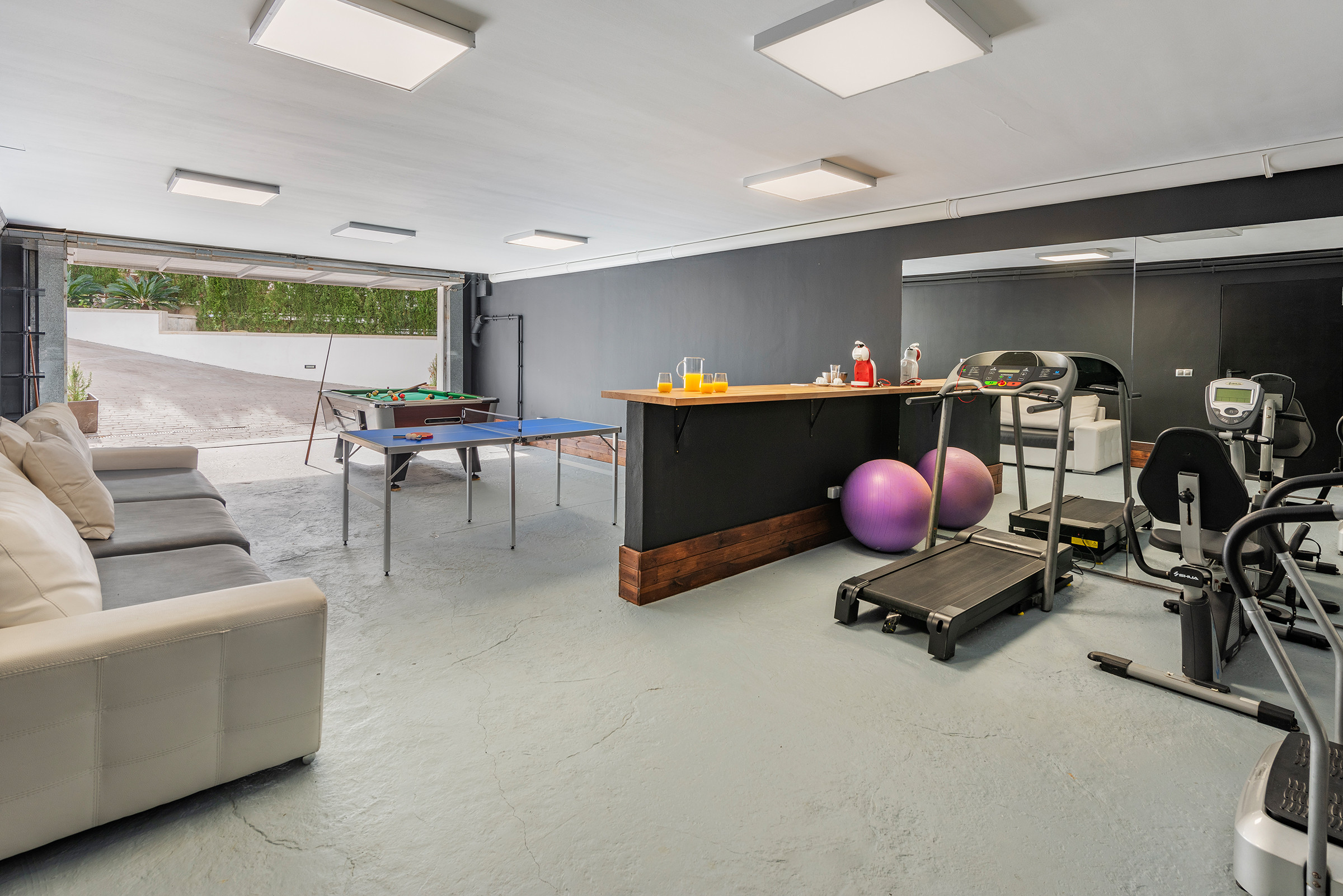 Im Kellergeschoss befinden sich Waschraum, Garage und Freizeitbereich mit Tischtennisplatte usw.