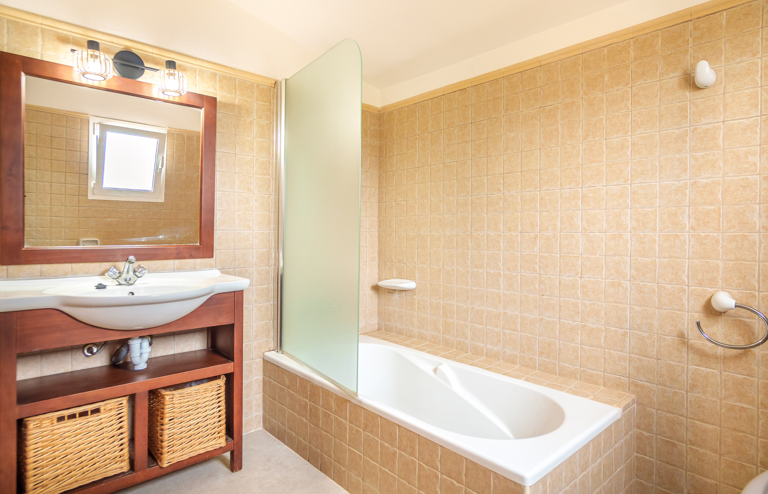 Im Obergeschoss befinden sich vier Schlafzimmer, alle auf Erholung ausgerichtet, und ein vollständiges Badezimmer mit Badewanne, ideal für Familien mit Kindern.