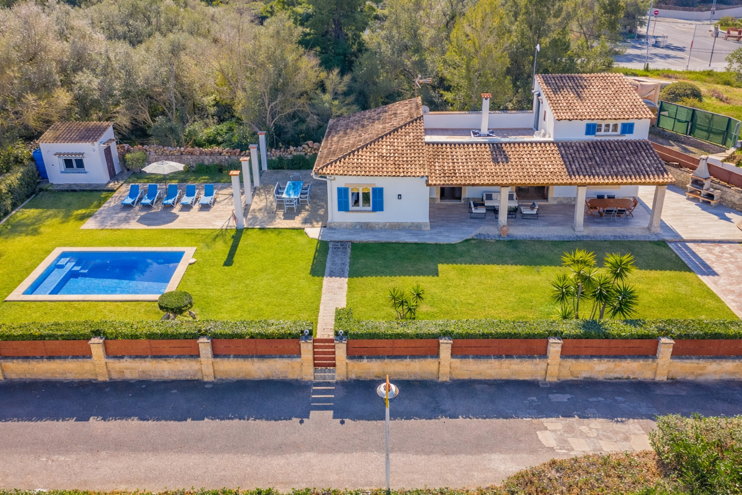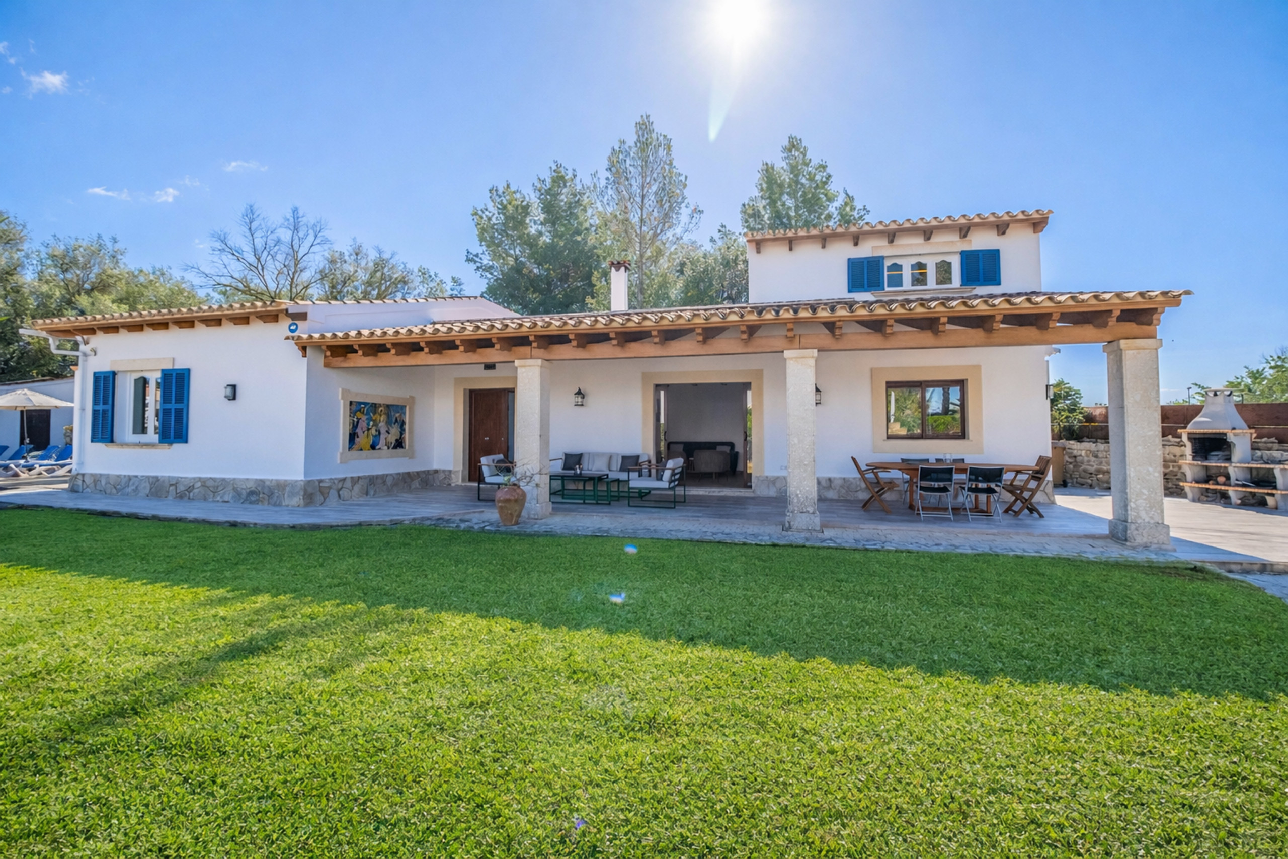 Dispose d'un jardin, de mobilier de jardin, de parcelle clôturée, de 30 m² de terrasse, de barbecue, de cheminée, de plaque de cuisson, d'accès internet (wifi), de sèche-cheveux, de chauffage pompe à chaleur, de climatisation dans tout le logement, de piscine privée, de parking en plein air, 1 Téléviseur, tv satellite (Langues : Espagnol, Anglais, Allemand).
