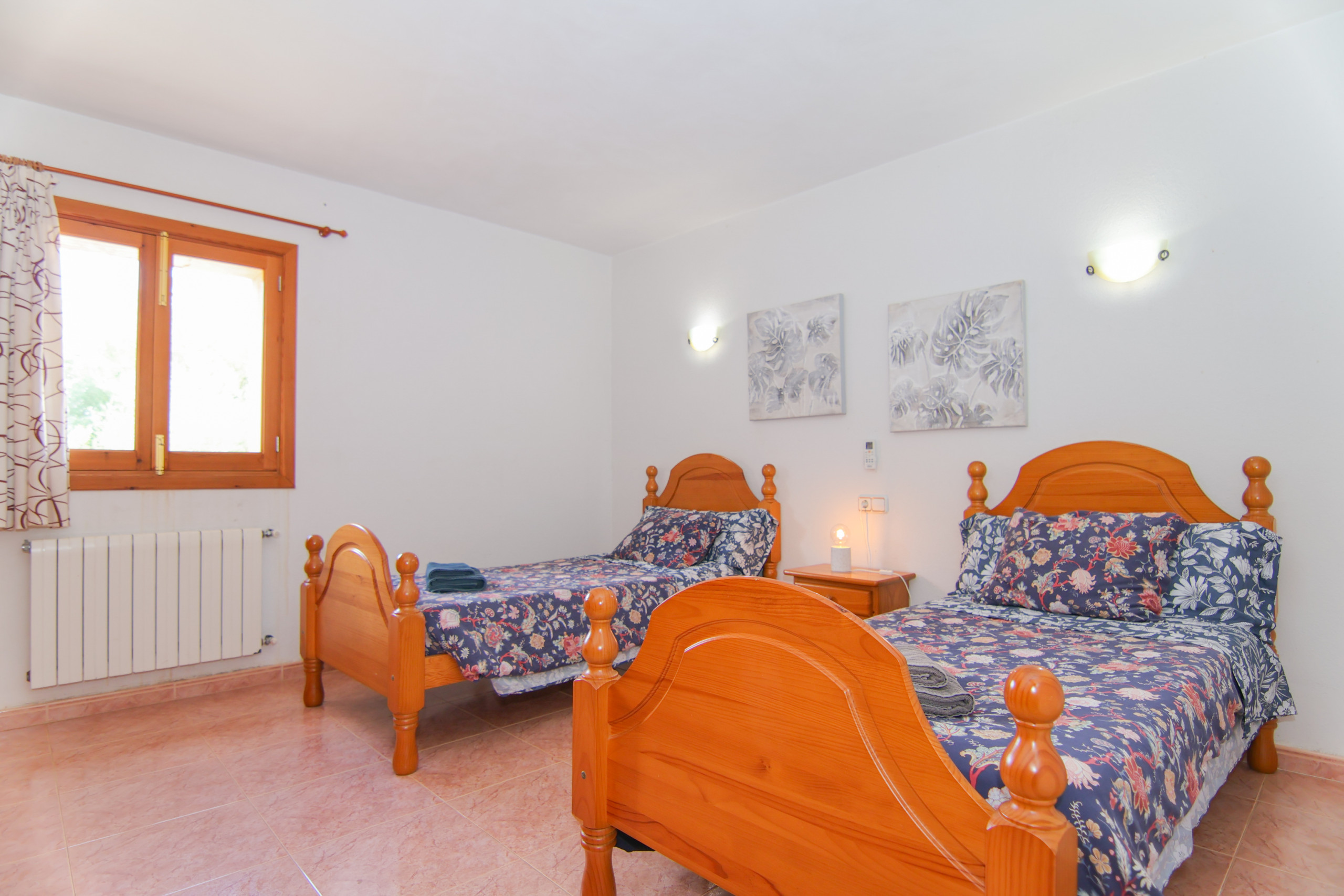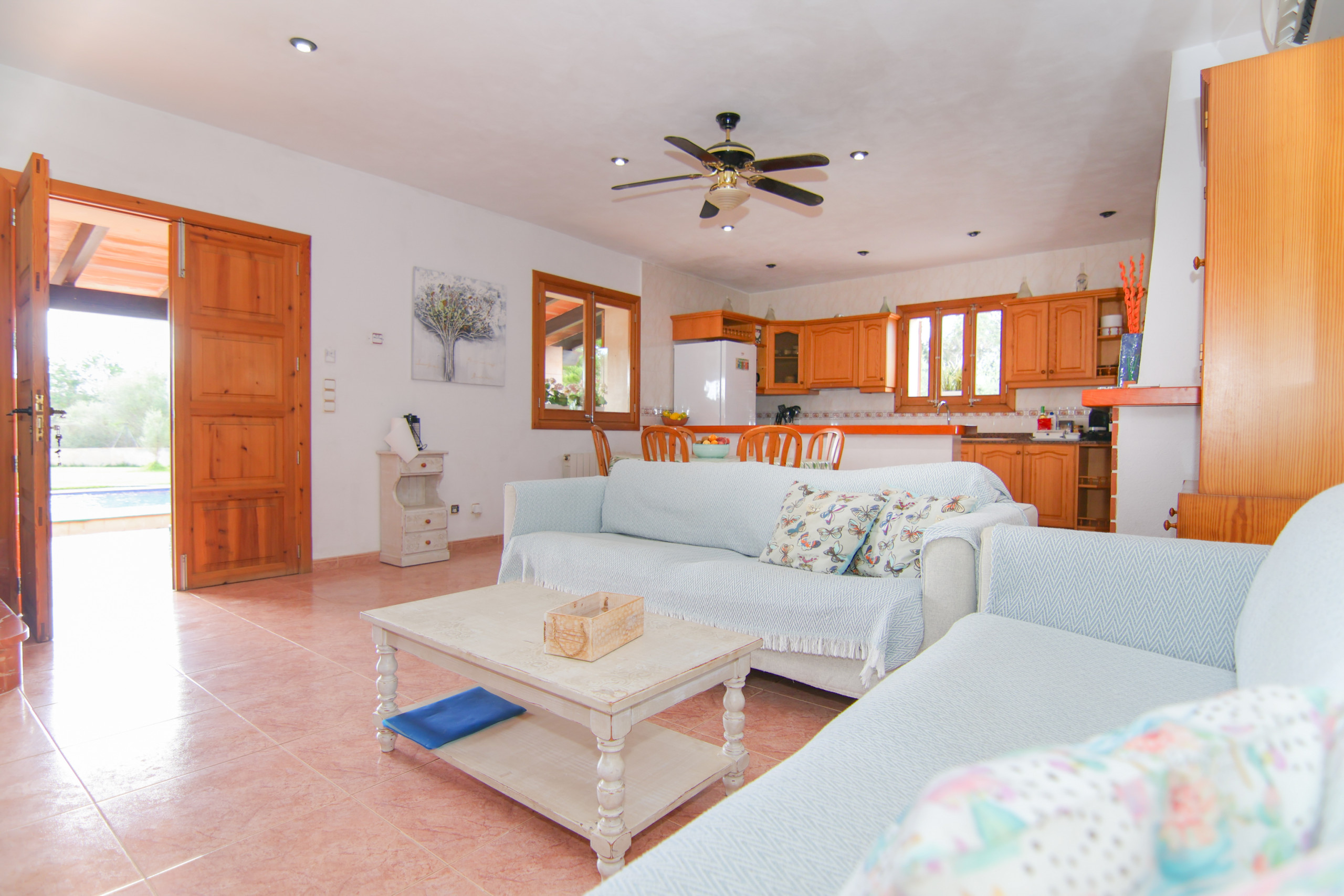 La typique ferme mallorquine fait 120 m² d'espace habitable et est prévue pour 6 personnes. Elle offre un salon-salle à manger accueillant avec des canapés, TV par satellite et WiFi. La cuisine entièrement équipée se trouve à côté du confortable salon où se trouve une grande table.