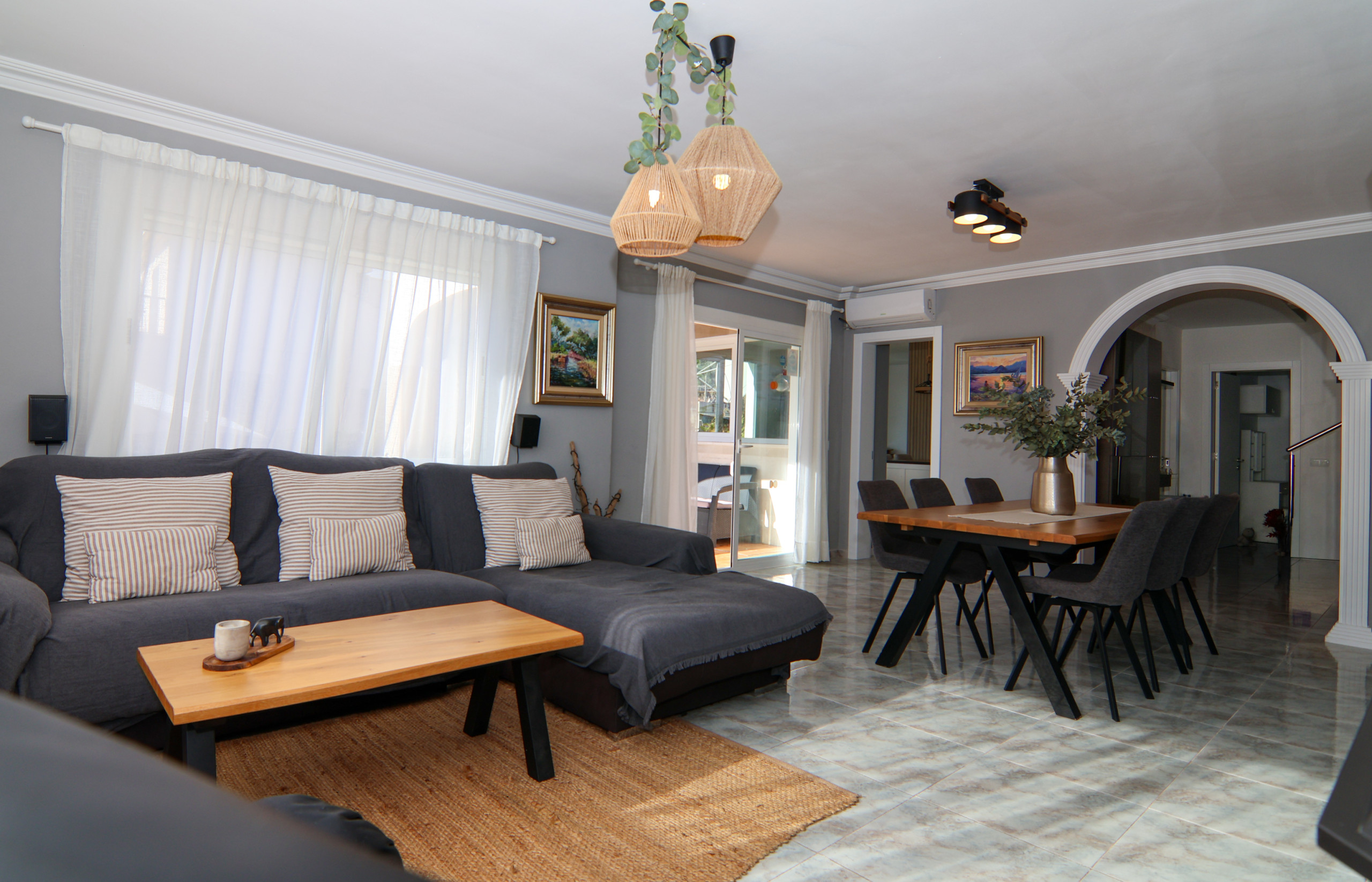 Salon-salle à manger spacieux avec télévision par satellite, canapé confortable et accès direct à l'extérieur.